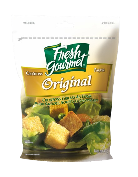 Croutones sazonados al estilo mediterráneo. Nuestros Croutons de primera calidad son deliciosos porque su elaboración es única. Justo después de la cocción, las hogazas de pan se cortan cuidadosamente en dados. A continuación, se doran en el horno hasta obtener su inigualable textura crujiente, antes de ser perfectamente sazonados.