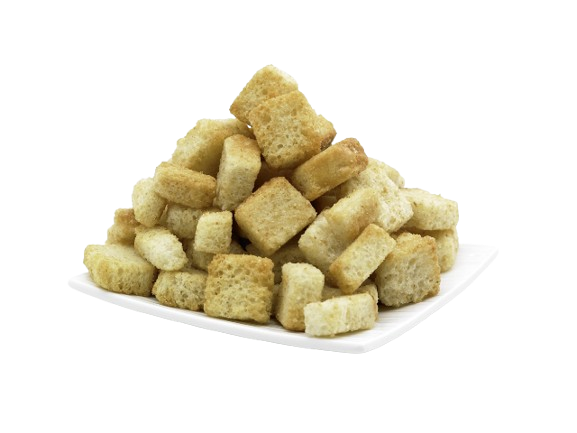Croutones de pan tostado de primera calidad, elaborados mediante un proceso único. Tras la cocción, las hogazas de pan se cortan cuidadosamente en dados y se doran al horno hasta obtener una textura crujiente inigualable.